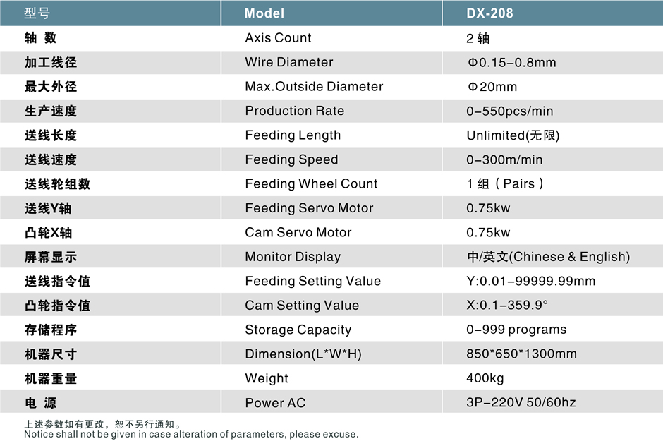 DX-208 compression spring machine is a 2-axis equipment consisting of wire feeding Y axis and cam X axis. It adopts Taiwan controlling system and Japanese industrial servo motor, each motion from the machine are directed by its CNC center.